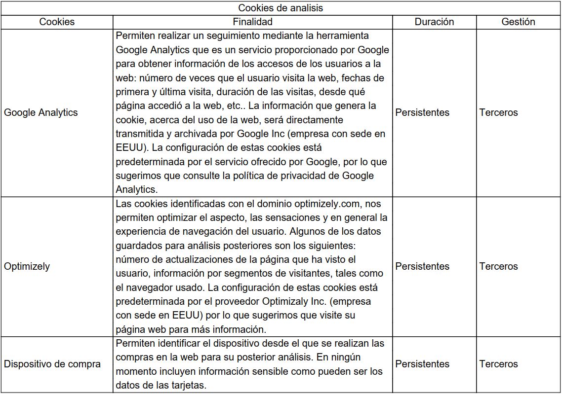 La información almacenada en las cookies de nuestro sitio web es utilizada exclusivamente por nosotros, a excepción de aquellas identificadas más adelante como ‘cookie de terceros’, que son utilizadas y gestionadas por entidades externas que nos proporcionan servicios que mejoran la experiencia del usuario. Por ejemplo, las estadísticas que se recogen sobre el número de visitas, el contenido que más gusta, etc… lo suele gestionar GOOGLE ANALYTICS.