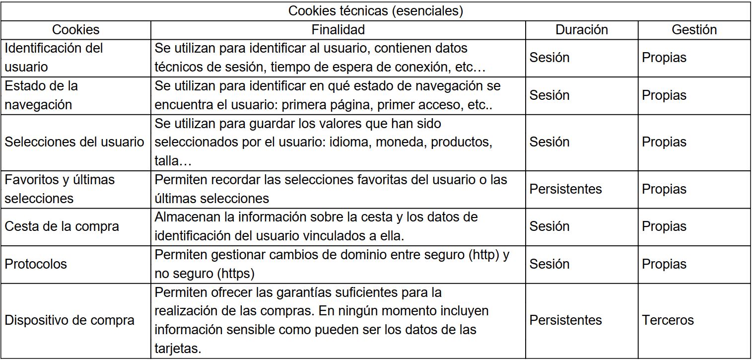 son aquellas necesarias para la navegación y el buen funcionamiento de nuestra página web, como por ejemplo, controlar el tráfico y la comunicación de datos, identificar la sesión, acceder a partes de acceso restringido, recordar los elementos que integran un pedido, realizar el proceso de compra de un pedido, gestionar el pago, controlar el fraude vinculado a la seguridad del servicio, realizar la solicitud de inscripción o participación en un evento, contar visitas a efectos de la facturación de licencias del software con el que funciona el servicio (sitio web, plataforma o aplicación), utilizar elementos de seguridad durante la navegación, almacenar contenidos para la difusión de vídeos o sonido, habilitar contenidos dinámicos (por ejemplo, animación de carga de un texto o imagen) o compartir contenidos a ravés de redes sociales.